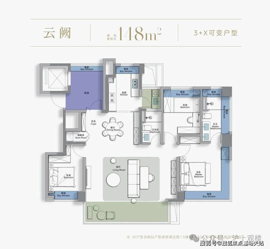 横厅连接近10㎡朝南阳台,兼顾洗衣晾晒与休闲观景;北向3.85米面宽餐厅与厨房等宽,备餐时可与家人互动,生活的烟火气与品质感互不冲突。建面约148㎡3+X房2厅2卫
