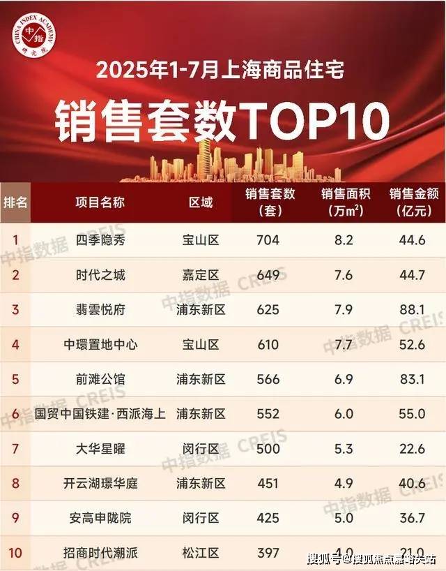 2025年1-7月,上海商品住宅销售套数TOP10项目合计销售5479套。其中,四季隐秀以704套占据项目销售套数榜单的第一名,时代之城、翡雲悦府分别以649套、625套位列项目销售套数榜单的第二、第三名。